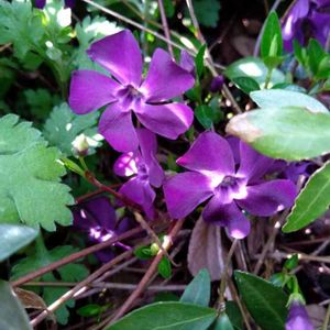 雑草取りで宝物発見 埋もれていたので掻き分けてパチリ、大好きな紫色ツルニチニチ草。💜 弦がいっぱい這いつくばってお邪魔虫だったけれども~💜癒やされました