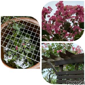 メダカの鉢にピンクのお花💕 見上げると、サルスベリの花が💕 暑くて気づかないうちに 今年も開花してくれました🌸🌸