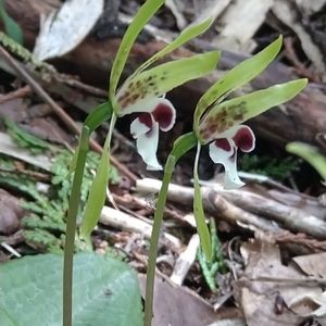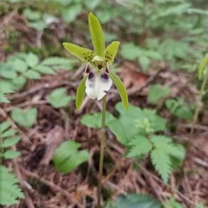 一葉蘭 (イチヨウラン) ラン科 幅広の葉が根本に一枚。 花は春蘭に似ていました。 50cmぐらいの登山道と迫る斜面の際に咲いていたので踏まれないか?盗掘されないか?心配なコ達でした。 来年、いいえ、すぐまた後にも会えますように。