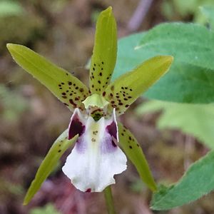 イチヨウラン 初めて見た不思議な形の花です😲 広げた手の平から何かがぶら下がっているような… 模様も興味深いです😃