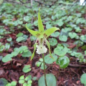 イチヨウラン(一葉蘭) 別名 ヒトハラン ラン科イチヨウラン属 イチヨウランは葉が一枚 卵円形で長さは3~6cm。 茎頂に直径約2〜3cmの花を1個付けます💕 唇弁は白色で紫色の斑点があります💜中央で3裂し中裂片が大きくなっています🤗 3枚のガク片と2枚の側花弁は💚細長くて 淡い緑色です💚 名前の由来は葉が1枚だけ根元につくことからとか❣️ 日本特産🇯🇵1属1種の貴重なお花です🙏 出会えた事に感謝です🙏 群馬県吾妻郡嬬恋村万座温泉♨️ 標高2000m付近に咲いていました🤳