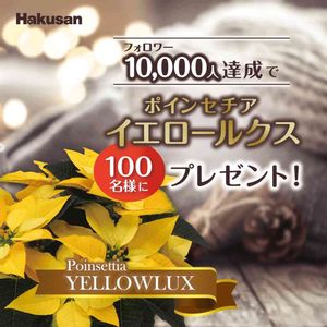 こんにちは。ハクサンです。 日頃の感謝の気持ちを込めて、黄色が美しいポインセチア イエロールクスを100名様にプレゼントします。 【応募方法】 ①HAKUSANのアカウントをフォローください。 ②「詳しく見る」を✔し、応募フォームからご応募ください。 ↓PCの方はこちら https://docs.google.com/forms/d/e/1FAIpQLSdT3Od__hhddtM7g2YuOYTy-WNlWAvRK--GhybUu8iMWYcFZw/viewform 【応募期間】 ~11月20日(日) 【当選者数】 フォロワー10,000名達成で100名様にプレゼントします! 【当選賞品】 ・ポインセチア イエロールクス 1ポット 【当選発表】 当選発表は、商品の発送を以って代えさせていただきます。賞品のお届けは11月末ごろを予定しています。 皆さまのたくさんのご応募お待ちしております。 🌸🌸🌸🌸🌸 ハクサンは、園芸品種を開発する種苗メーカーです。アジサイ、シクラメン、ポインセチア、観葉植物など、毎年多くの品種を皆さまにお届けしています。40年以上培ってきたノウハウを活かし、日本の気候に適した品種を厳選し、見た目の魅力はもちろん鑑賞価値が高い植物を開発しています。 取り扱い品種数は日本最大級※。もしかするとあなたの育てている植物もハクサンの品種かも…❕❓ ※ハクサンはガーデニング植物のブランド「PW JAPAN」の運営も行っています。PWはハクサンを含む世界20社が参加する植物の国際ブランドで、PW JAPANアカウントから情報をお届けしています。そちらも✔してみてくださいね。 ※ハクサン調べ 1986年以降の農林水産省種苗登録品種累計。