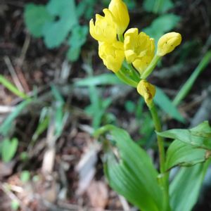 コクラン(黒蘭) ラン科クモキリソウ属の多年草 分布 本州(茨城県以南)・四国・九州 緑地公園の薄暗い林の中、 コクラン、3株中、2株に、花芽をつけた茎が立っていました😆 昨年の冬、花は終わっていて、 葉と花茎だけが残っている姿を見て、 どんな花が咲いていたんだろうな~🤔? と気になっていたので、 見に行ってきました。 花は、花茎の下の方の蕾から開いていくようで、2輪、咲いていました。 花は、1㎝くらいと小さく、 落ち葉の色に紛れて、目立ちませんが、 葉っぱを見て、目当ての植物だとわかりました。 後ろ姿?しか撮れず、花のつくりは、よくわかりませんが😓、 ランの花らしい形だと思いました。