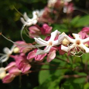 クサギ 右の花は雌性期に入っていて、オシベがクルリと丸まっていますでしょ?4本のオシベがしっかり伸びている時は雄性期でメシベはまだ閉じています。 自家受粉を避けるための工夫ですが、よく出来ています♪そんなところを見るのも面白いです(*^^*)