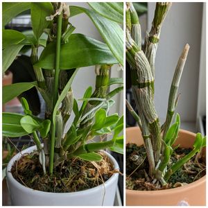 株分けしたデンドロビウム雅の様子が全く違ってます。白い鉢の方は元気で根本から新芽も次々。根っこが出てるのは高芽になるのかな? ベージュの鉢は花が終わったバルブには萎びた葉っぱが2枚だけ。根本の新芽はいくつがありますが⤵️こんなに生育差がでてこれからどうしたらいいのか?