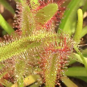 群馬県尾瀬ヶ原湿原の「ナガバノモウセンゴケ」です。別に、モウセンゴケ(ヒロバノ)もあります。