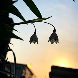 夕暮れ。。。 スノーフレークと❤️ 花言葉は「純粋」「純潔」「汚れなき心」。 花びらの先端にある緑の斑点が、純白で清楚な花をよりいっそう際立たせていることにちなむ。