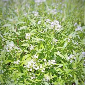 他の草に埋もれて、小さな花が咲いていました。 ファセリア カンパニュラリア。 コバルトブルーの可憐なお花です。 カネコ種苗 ミックスフラワー ロータイプ