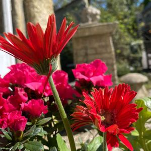 おはようございます^ ^ 今朝は冷えてます💧 赤い色は暖かく感じる…❤️ ガーベラと奥は秋咲きのアザレア…かな? 暖かくして過ごしたいですね😊 10月15日撮影