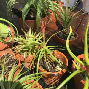 名無しエアプランツ🍀 たぶんシーディアナ 花咲いた後のセール品 夏に購入後、新株出来て成長中なので生きているぽい💧 後ろの小さいのはダイソーのシーディアナ(これも成長中)、絡まってるのはウスネオイデス(途中で切れ生存不明)