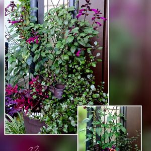 今日も秋晴れ☀️ まだ紹介していなかった玄関前の寄せ植え💜 春にペチュニアが寄せてあったけど(右下pic)、梅雨の雨続きや日照不足などで枯れてしまい、夏にアルテルナンテラ レッドフラッシュに入れ替え、今はサルビア ファイアーセンセーションもコプロマス ブロックケイもモリモリ〜😆🎶