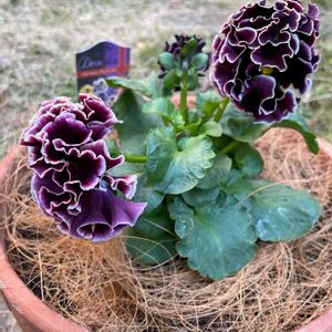 こんばんは 奇跡のような出会いでお迎えできた パンジー ドラキュラ🧛♂️✨ 💜サトウ園芸のオリジナル品種💜 《進化を続けるフリンジパンジー》 このドラキュラは種をまいた全てがゴージャスなフリンジになるわけではありません……。 2~3割生まれてくるかどうかの、とても希少なパンジーです。 毎年 素敵なフリルの個体を選抜し、毎年進化をさせています。 (🏷⸒⸒より) 今回の出会いに ꕤ*.゚✿感謝(ㅅ˘˘)♡*.+゜感謝✿ꕤ*.゚