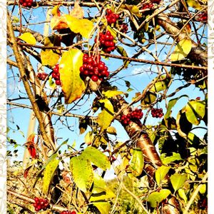 もう少し残った真っ赤な蔦の葉っぱ🍁と たくさんの干し葡萄のような実 ツタはブドウ科の植物だから ブドウの実に似た実があって当然だけど こんなにたくさんの実、葉っぱに隠れて 今まで気がつかなった!