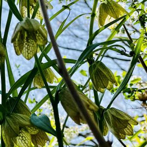 おはようございます 💠今日のお花 バイモ💠 お散歩中に出会ったバイモ(アミガサユリ) 姿勢を低くして何とか🤳できました😅 背景には、ユキヤナギとまだ蕾のソメイヨシノ 🌸が咲いたら、どんな風景になるのかな〜
