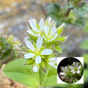 この花も見つけました♡ 白い小花がキュート、♡ハート型♡ 可愛いです💕 ハコベかなぁ。。。って思ったんだけど、 帰宅して調べました📖 花弁の違いと毛深さが決め手になりました。 花弁は同じ5枚なのに、ハコベの方は10枚に見えるね😊 切り込みの深さに違いが出るんだって❣️ ふむふむ、そーなんだね^_^
