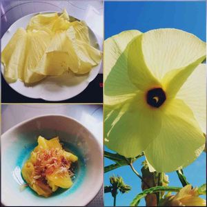 道の駅に行ったら珍しい野菜が売っていました。 白い物は“アップルゴーヤ”といって苦みが少ないそうです。生でサラダに入れて食べたりします。 黄色いのは“花オクラ”で、サッと湯がいてポン酢で食べるとGood!又サラダとして生のままでドレッシングをかけて食べるのもOK🙆♀️ ※ビタミン・ミネラル・カルシウム・βカロチン・鉄分・食物繊維が豊富 花オクラを、早速湯がいて冷水にとって三杯酢で食べてみました。ヘタを箸で摘まむと、焼きナスの皮むき状態に似ています。一気に口に入れると、ふぁっとした感触からヌメリが少しあって細かな繊維質を噛んで、ゴクリと飲みこむ感じです。全くクセがなく、ドンドン口に入れては食べ入れては食べ、あっという間に7本食べてしまいました。 それにしてもオクラの花が食べられるなんてビックリでした。