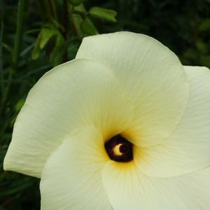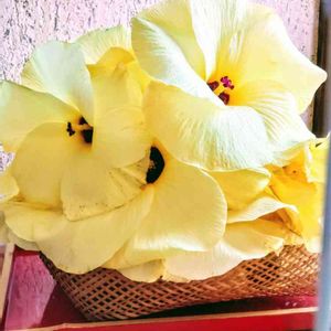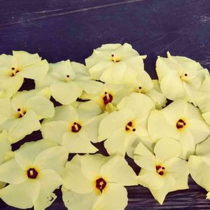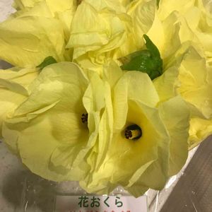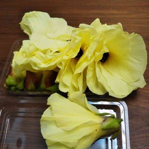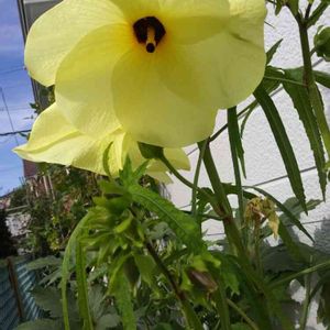 花オクラ(トロロアオイ) 花を食べるオクラだよ✨って、お向かいさんにいただいた苗に、初めて花が咲きました。 花径20cmほどもあり、 透明感のあるレモン色の花びらを、濃い紫の花芯がきゅっと引き締めて、美しい姿です。 お向かいさんに報告に行ったら、朝取れを10輪ほどいただいたので、これから茹でてみます。