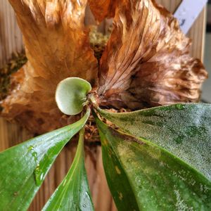 気温23.8℃ 湿度56% 暖かくなってビカク達のスイッチが入っております。 こちらは右貯水→左貯水→右貯水→左胞子葉?のラッシュ🌿 うまく貯水葉が伸びきらなかったのが悔やまれます😩