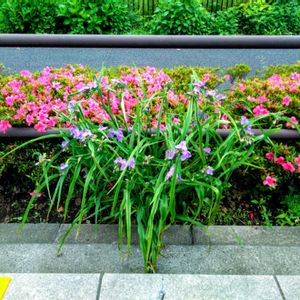 散策中の出会いです。 水元公園沿いの花壇に、ツツジと露草が、咲いていました。