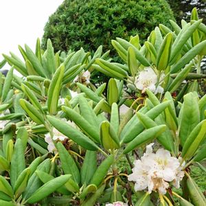 西洋シャクナゲザッフオー 今朝雨の庭で、西洋シャクナゲが咲いているのを発見 ☔️雨に打たれて痛々しそう❣️ ザッフオーは、春と秋に咲く2期咲きのようです。 春は、2輪のみの開花でしたが、現在16個の壷が、🤍 その一つが咲き始めていました🎶 白い花弁に入っている濃い紫色の斑点が目立って、素敵です💕 和名 秀峰