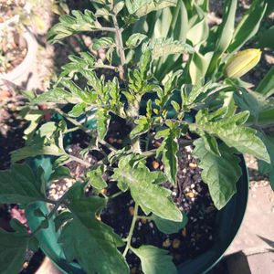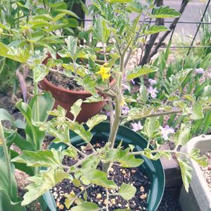 苗を植え付けて 3週間のミニトマト(ぺぺ)🍅 黄色い花と蕾がいくつか😍 そろそろ支柱が必要かな🤔