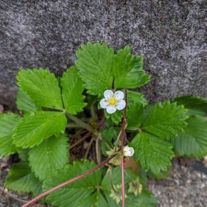 ど根性ワイルドストロベリー。元々植木鉢の苗からランナーが伸びてたのですがそれがコンクリートの隙間で根がついてしまいました。本体は枯れてしまったのですが今年はこちらの苗からいちごを2つ食べました。またお花が咲いているので楽しみです。