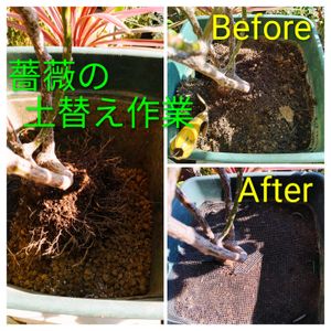 ❶ツル薔薇の鉢植えの土入替え作業🌹 先週から晴れた日にツル薔薇の土替え作業を開始してます。 毎年この時期年内迄につる薔薇の土替え作業して来年から木立ち性薔薇の土替え作業をします ❷作業前のツル薔薇の株元 根が張って土の上もびっしりです ❸スコップで幹から10cm外の根をブスブス切りながら土を撤去して後に赤玉土とオルトランをパラパラ撒いた写真です ❹新しい薔薇専用培養土+赤玉土を混ぜたのを入れてコガネムシなど入らない様に鉢底網を土の上に敷いてます。この上に更にココヤシファイバーを敷いて霜や乾燥予防します