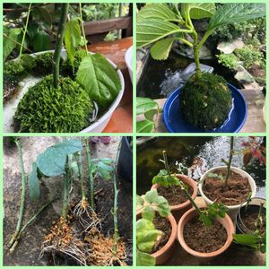 額紫陽花の苔玉 風で落下😭割れてしまったので作りなおしました。 薔薇の苔玉🌹順調です😁 ピンクのつる薔薇、先月剪定✂️した枝に根がついたので鉢上げしました。