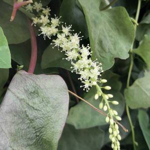 🌀つる性植物🌀 秋に長い花穂を伸ばして咲く 〰︎白くて小さな5弁花の花です。 花そのものは食べられませんが 葉 茎 球根 ムカゴ全てが 食用可能です。 栄養価が高く 健康野菜🥬です🎶 オカワカメ ツルムラサキ科 別名 雲南百薬うんなんひゃくやく 和名 アカザカズラ