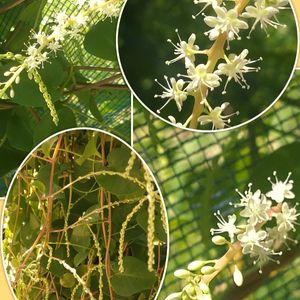 オカワカメの花 ツルムラサキ科アカザカズラ属のつる性多年草 別名 アカザカズラ 雲南百薬 中国から長寿の薬草として伝わる。 球根とムカゴと茎と葉を食べることができる。茹でた状態が見た目や食感ともにワカメによく似ていることからオカワカメと呼ばれるようになった。