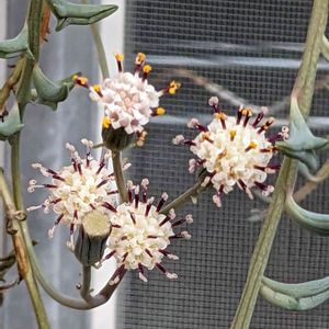 今日は横殴りの雪が降ってきたので、ベランダの植物の一部を室内へ避難💨 なーんか変な匂いがするなぁ…とおもったら七宝樹錦の花から匂ってた(>_<)!! こんな香りだったとは😅 初めて花を咲かせてくれたけど、さすがセネシオ属、グリーンネックレスの花と似てるー😃