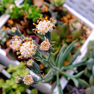 先日、ベランダで多肉の手入れをしてて、前髪が棚だか植木鉢だかに触れたなーと思ったら、目の前に白い粉がパラパラ落ちてきて… フケ?と思ったらこの子の花粉でした 当たっちゃってごめんよ~ ドルフィンの花が咲いたの初めて 翌日、他の枝からも花が咲いてます