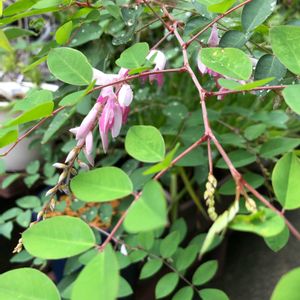 庭藤がピンク💗と白🤍 💗🤍💗🤍💗🤍💗🤍💗 の可愛い花を覗かせています💕 何しろこの子は葉の下に隠れて咲くので 葉を避けて撮りました💦 恥ずかしがり屋も困ったもんだ