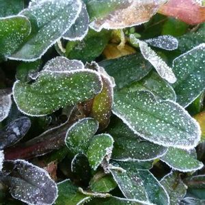 アジュガチョコレートチップ 初霜です。 霜が降りるとクタ~ンとなっている植物は悲しい。 アジュガは平気そうですね。