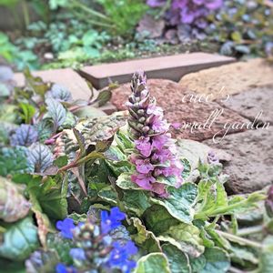 トリコロールカラーのアジュガ(名前失念💧) 追記:ピンクライトニングの可能性大デス。ひなさんありがとうございますm(_ _)m💓 ピンクのお花が咲くとは嬉しい誤算❣️ 手前のブルーのアジュガは、'チョコレートチップ'
