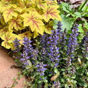庭のアジュガが咲き始めました😊 奥のヒューケラも元気いっぱい🍁 日当たりの悪い我が家の庭にピッタリな子達✨ 去年庭のより日当たりの悪い場所に植え替えてから調子が良いです😆