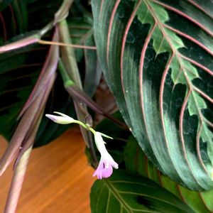 おはようございます☀️ マランタ レウコネウラ さんにお花が咲きました😊 薄ピンクで可愛いらしいお花です💕 葉っぱは派手だけどお花は清楚系😁