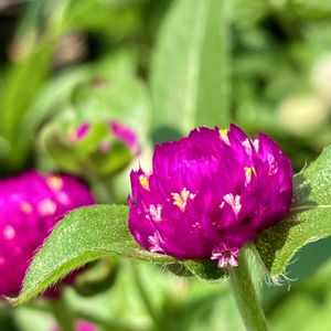 千日紅,英名Globe amaranth. お花の中にもう一つの小さな小花が咲いている? 濃いピンク色のお花に見えるのは苞、つぼみを包むように葉が変形した部分だとか。