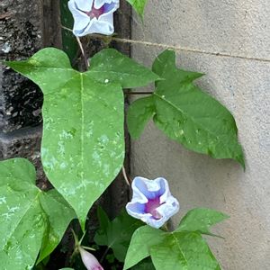 8/8 🌀☔️ 特別なアサガオなんですよ‼️ 宇宙朝顔です🌏 2010年に宇宙飛行士の山崎直子さんと一緒に9ヶ月宇宙に滞在したアサガオの7世代目です! 楽しみに待っていたのに😫 こんな台風の朝に咲いちゃいました。 雨がおさまったので記念撮影! あー😫雨風で花びらが傷んでるー お日様にあわせたかった〜