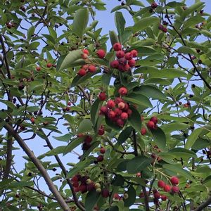 ジューンベリー🌳 実🔴🔴 保育園庭 今年のベリーは生り年のよう。たわわに赤が美しくかわいいです😍 それにつけても、巨大桑の実を例年付けていた枝はひどく剪定されて、見る影もなし🫣 ウロウロ散歩は楽しや〜♪( ´θ`)ノ