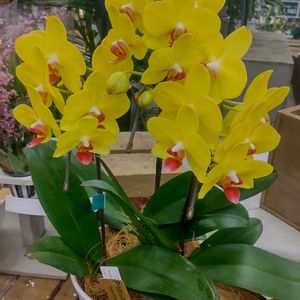 ホームセンターで出会ったこのコチョウラン(胡蝶蘭)は ファレノ イエロー ナオミゴールドです。 胡蝶蘭では珍しい鮮やかな黄色で アクセントとして入っている小さめの赤橙色のリップが上品な佇まいです。 日本で品種改良されたもので 2018年のフラワー オブ ザ イヤーを受賞しているのだとか…。 花持ちはよく 3ヶ月以上楽しめるようです…。 フィリピン インドネシア 台湾など熱帯アジア原産。 ラン科コチョウラン属の多年性着生植物。
