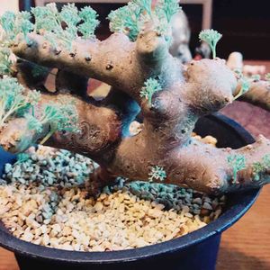 サルコカウロン ムルチフィズム 信州西沢サボテン園にて購入。 この横へ伸びるごっつい枝とそこから生えるパセリのような繊細な葉っぱのコントラストが秀麗だと思います。 なんとなく和の趣を感じるため、盆栽鉢か和鉢に植え替えても面白そう。 冬型ですが、もう目覚めて活発に動いてますんで、室内管理してます。