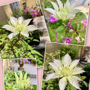 クレマチスが咲いてきました ➀サマリタン・ジョー 白に紫のエッジが入る上品なお花 あまり伸びないので育てやすい ➁あわい GSで沢山のお花を丁寧に素敵に育てていらっしゃる方のお写真を拝見し、可愛らしい姿にお迎えしました 白にピンクとグリーンがまざり一部葉のような姿になる (及川フラグリーンHPより) ➂桃花 ➃ティータイム・オブ・モナリザ その後…未熟なのかタグのようなお花にはなりません😅 ➄華川 糸状の花芯が華やかで白とグリーンのグラデーションが素敵です