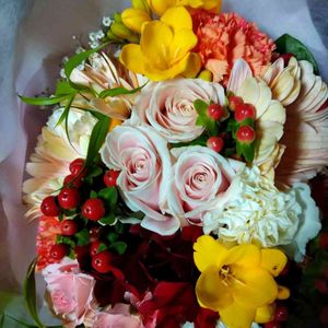 赤、ピンク、黄色、緑の組み合わせは、かわいいですね❤️ 小さなかわいい花束をいただいたのでいけてみました😊