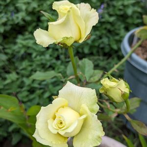 久々に行ったホームセンターで一目惚れ♥️ 樹姿がシュッとした美しいバラを衝動買いしました。 咲き進むとレモンイエローになるようですが、 蕾は淡い緑色てす。 調べたのですがあまり有名なバラではないようです。 ヴェルベールといいます。 地植えにする予定です。