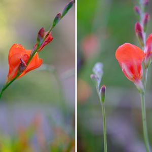 【トリトニア】 南アフリカ原産、アヤメ科多年草 春に花茎を伸ばして、その上部に10輪ほどの花を咲かせる。 花はろうと型で直径3cm、6枚の花びらをもつ。 草丈:30~50cm、 開花期:4月~5月 花色:オレンジ色、ピンク、赤、黄、クリーム色、白など picの品種は、原種トリトニア グラディオラリスと思います 近所の空き地にて