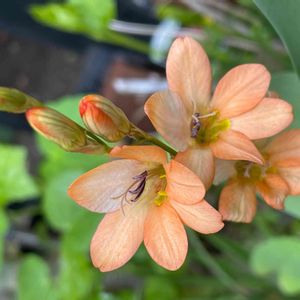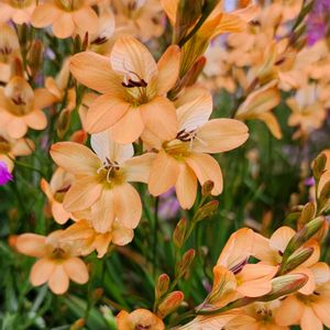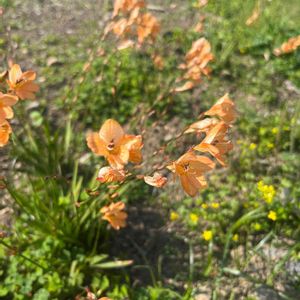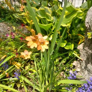 トリトニアが今年も咲いてます🌿 Tritonia 別名:Flame Freesia 下のピンク花は… シラー・カンパニュラータ(ツリガネスイセン)