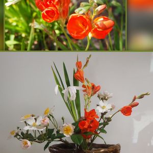 庭先の花を〜🌿 盛花です * トリトニア・クロカタ * 白花紫蘭 * 野茨 ( ノイバラ ) 花器 叔母の陶芸作品 篭の編み目模様が入り 中央に持ち手がついています トリトニア 学名 Tritonia-triton crocata アヤメ科の球根です クロカタは サフラン色という意味 あちこち花の向きが変わるオレンジの鮮やかなお花です 💛