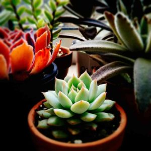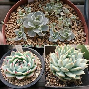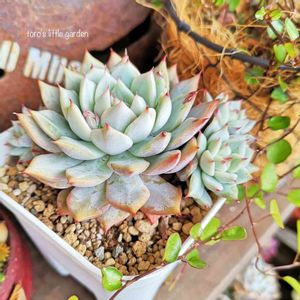 こんにちは😊💗 今日明日と、寒さが厳しくなるそうですね。 私の住む街でも、今シーズン初の雪がちらついています。 picは温かい室内管理の多肉たち。 外では寒すぎて、葉色が悪くなってしまったカランコエ類と、可愛すぎて過保護気味のネオンブレイカーズ。 そして‥お見せしたいのは、中央のジャガーローズです。 早く大きくしたくて、冬でも底面給水しています。 良いのか悪いのか、よく分かりませんが、一枚の葉っぱから、やっと2号鉢まで成長しました。 生まれた時から見ているので、愛着もひとしおです🤗
