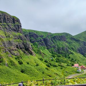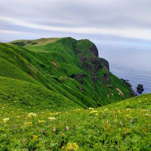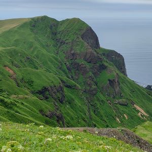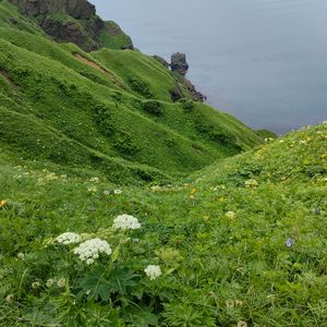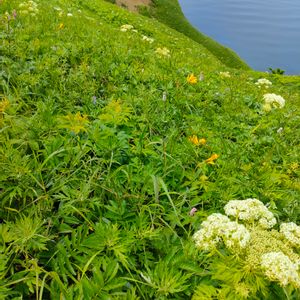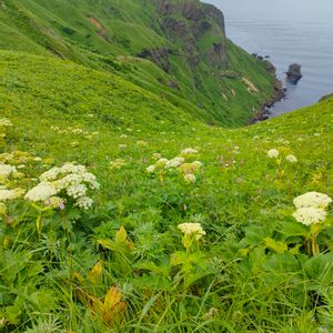 礼文の名を冠したレブンソウ💕🎶 マメ科 オヤマノエンドウ属 北海道礼文島の固有種。 礼文島の桃岩展望台や桃岩歩道などで見られる。 草丈は10〜25cm。 1本の花柄に数個〜十数個の紫色の花を上向きに咲かせる。 花期は6〜7月。 和名の由来は、礼文島でのみ見られるため。 風当たりの強い場所に生育する背丈20cmほどの植物。 全身に細かな柔毛が生えており、葉や茎が白っぽく見えます。 他の似ている植物とは、柔毛の有無の他に、花が上向きに咲く姿から見分ける事ができます。 環境省レッドデータブック・絶滅危惧IA類に分類されている。 なかなか出会えず、 やっと出会ったそのお花の目の前で、 じっくり写生をしておられる方が😅💦 まだ何処かで出会える事を期待して、撮ったpicはこれだけ😰💦🤣 ちょっと寂しいので、桃岩展望台コースの途中の景色をご紹介致します🙇‍♀️💕🎶 ③ 桃岩展望台からの桃岩 ④ 桃岩展望台コースより利尻山を望む ⑤ キンバイの谷を抜けてつばめ山へ向かう途中の展望 このコース、尾根に沿って歩くので眺めは抜群‼️ 絶景の連続です🥹✨💓🎶 しかし風が強い‼️強い‼️ 小さなお花は撮れません😰💦🤣 うっかりすると風に煽られ、この身も飛んでしまいそう〜➰💦💦